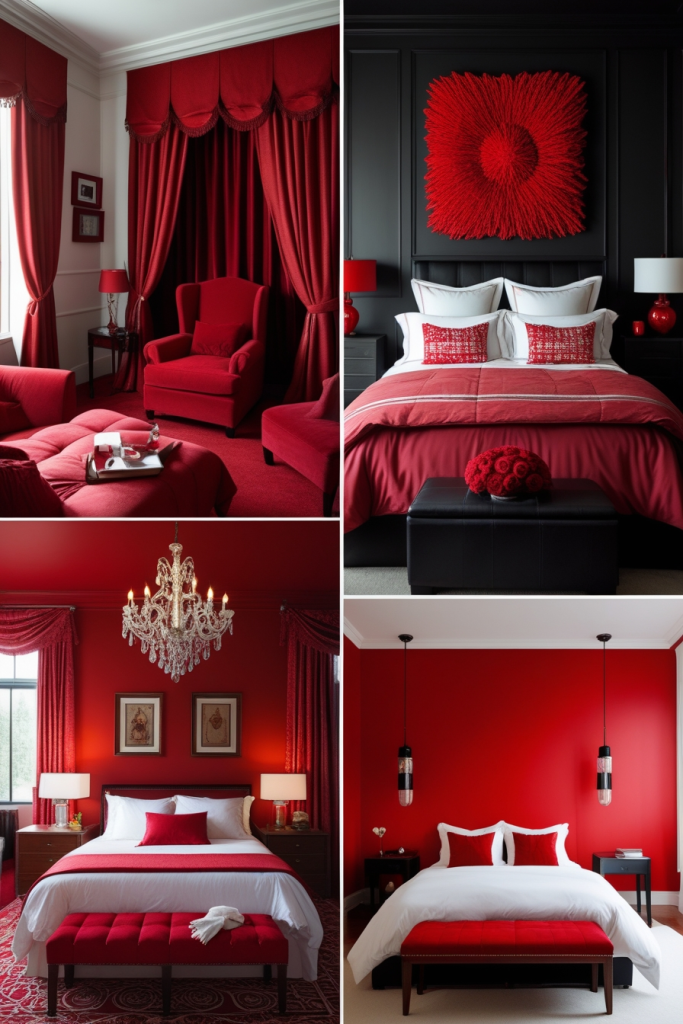 The wall collage exemplifies how red can elevate a bedroom’s look to feel both luxurious and dramatic. Deep reds paired with black accents, as seen in the top left and top right designs, create intense visual interest and sophistication. Rich textures like plush bedding, floral wall patterns, and elegant chandeliers amplify opulence.