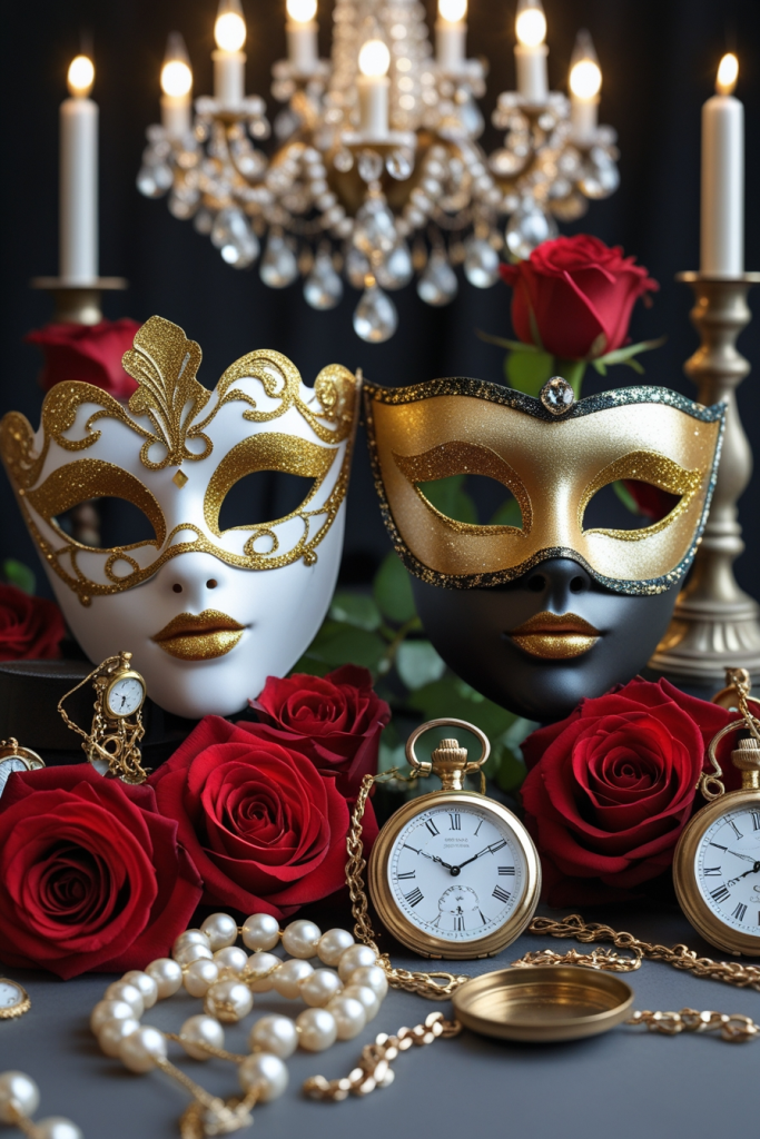 Mystery arises through the use of shadow and soft lighting, often from candles or dim chandeliers, which obscure full visibility and encourage curiosity. Masks themselves are a direct symbol of secrecy, allowing guests to conceal their identities while maintaining elegance.