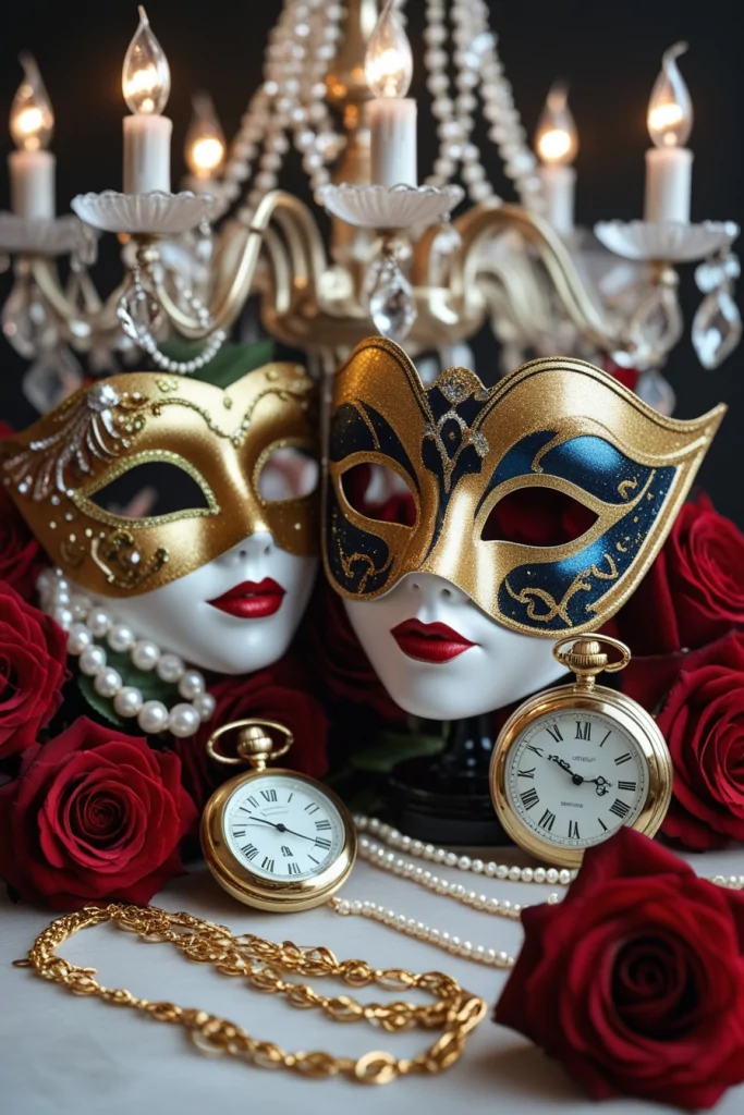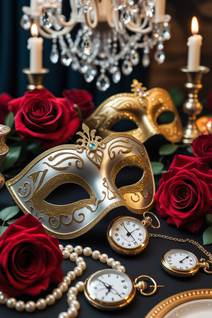 A whimsical and enchanting party theme draws guests into a world of elegance and mystery through carefully chosen decor and details. It features elegant masquerade masks adorned with gold, glitter, and intricate designs, creating an atmosphere of sophistication and intrigue. Surrounding elements like rich red roses, vintage pocket watches, pearl necklaces, and ornate candle holders enhance the timeless and magical feel.